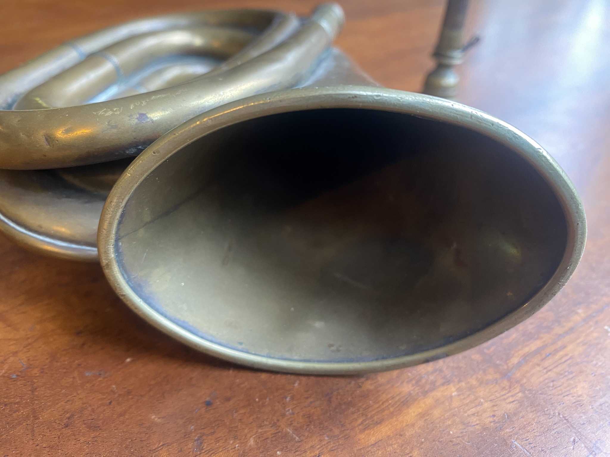 Cycling 'Buglet' A good, very rare cycling 'buglet' by Henry Keats, late 19th C. Stamped with maker's name on the bell, Henry Keats and Sons , Matthias Rd, Stoke Newington, London : With original mouthpiece, stamped Henry Keats. All made in brass, 4 turns, plays well, with minor dents, never repaired, all joints intact. Dimensions: overall length 16 cms or 6 3/8", excl mouthpiece, max height 13.5 cms or 5 3/8", width 6 cms or 2 3/8" Bello oval 85 mm or 3 3/8" by 60 mm or 2 3/8". These are very rare, and this one in brass is even more rare, (most are copper with brass.) An overall delightful item for any collection, and working too!